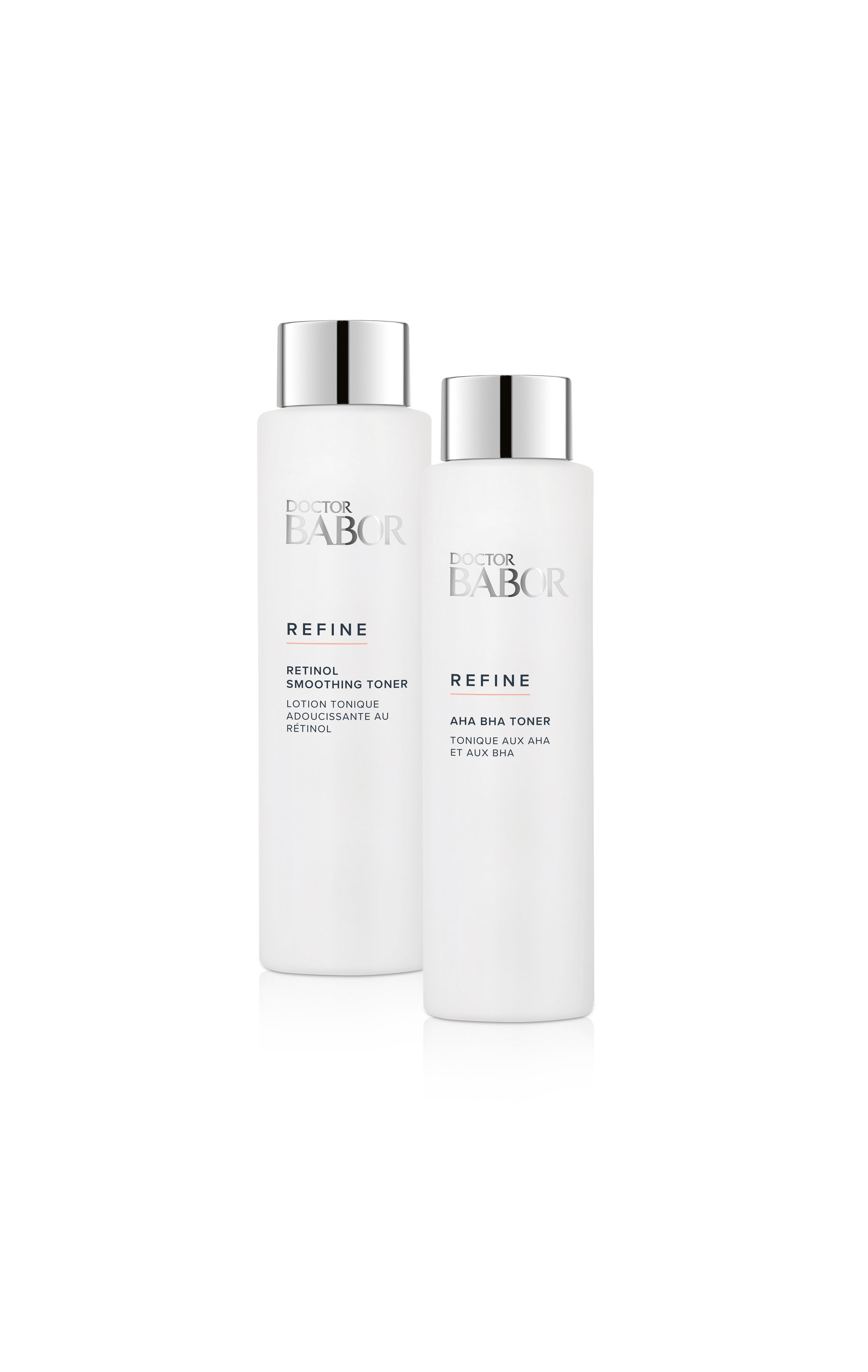 DOCTOR BABOR REFINE präsentiert gleich zwei neue Toner, die die Cosmeceutical Power auf ein neues Beauty-Level heben! Der innovative DOCTOR BABOR RETINOL SMOOTHING TONER und der DOCTOR BABOR AHA BHA TONER begeistern durch hochwirksame und perfekt aufeinander abgestimmte Power-Wirkstoffe, für ein verfeinertes und glatteres Hautbild. Die Toner eignen sich ideal als Ergänzung für die tägliche Skincare Routine und runden die Gesichtsreinigung optimal ab. Effektiv und schonend bereiten sie die Haut auf die anschließende Pflege vor! Die Toner eignen sich für alle Hauttypen, mit dem Wunsch nach Regeneration, Verfeinerung des Hautbilds und Teints. Für strahlend schöne und gepflegte Haut!