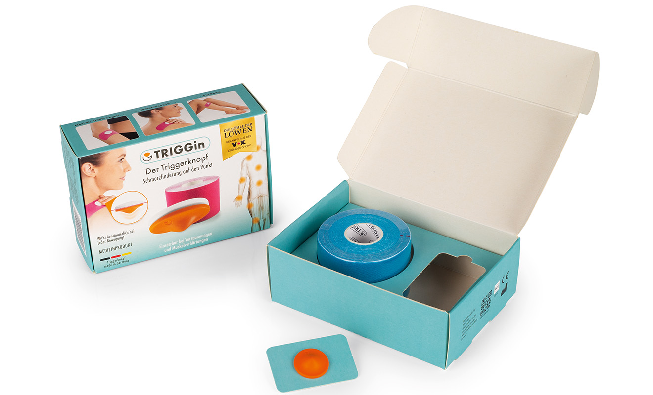 TRIGGin kann Verspannungen und Muskelverhärtungen geschmeidig machen und die Durchblutung fördern. Einfach im Alltag anwendbar: Schmerzpunkt ertasten, Triggerknopf dort platzieren und dauerhaft auf die Muskulatur wirken lassen. Das Gründertrio konnte in der VOX-Gründershow „Die Höhle der Löwen“ punkten: Begeistert von dem Medizinprodukt gingen die Investoren Carsten Maschmeyer und Ralf Dümmel einen Deal mit Lars Mayer, Jan Winter und Bastian Hehner ein