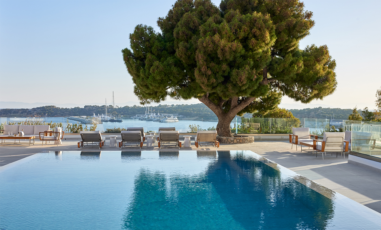 Der von Kokosnussbäumen umgebene Pool wurde komplett zu einem Infinity-Pool umgestaltet, dessen Wasseroberfläche mit dem Horizont zu verschmelzen scheint. Von hier genießt man einen beeindruckenden Panoramablick auf die azurblaue Lagune der Grand Baie.
